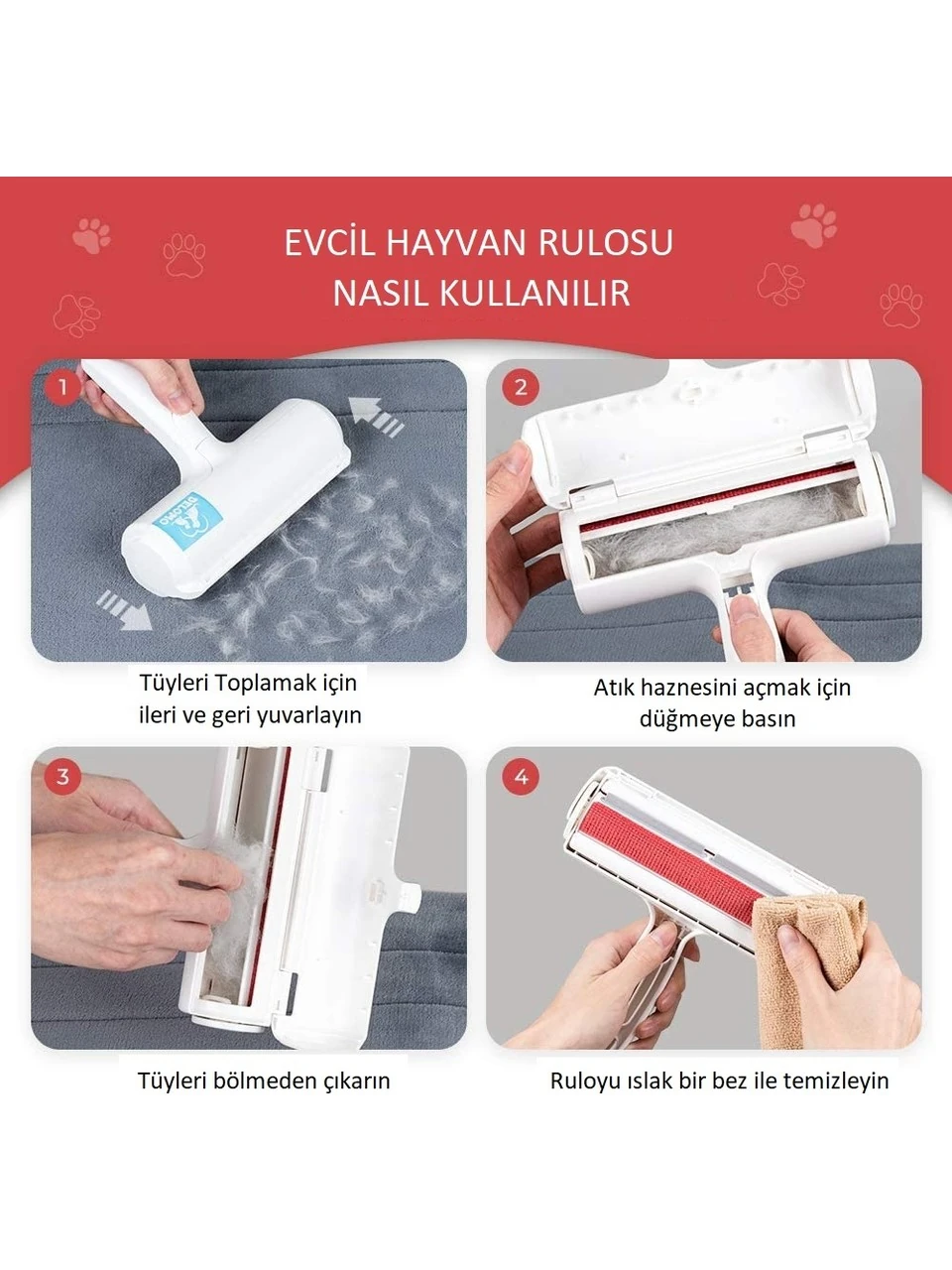 Temizleyiciyi tüylerin yoğun olduğu yüzeylerde ileri-geri hareketlerle kullanın. Fırça, tüyleri ve tozları hazneye toplarken siz sadece keyfini çıkarın! Kullanım sonrası hazneyi açıp birikenleri boşaltmanız yeterli. Kedi köpek tüy temizleyici olarak tasarlanan bu ürün, suyla yıkanabilir yüzeyiyle her zaman hijyenik kalır. Kıyafetlerinizi giymeden önce hızlı bir tarama yapın ya da halılarınızı misafir gelmeden şipşak temizleyin; bu kadar basit!