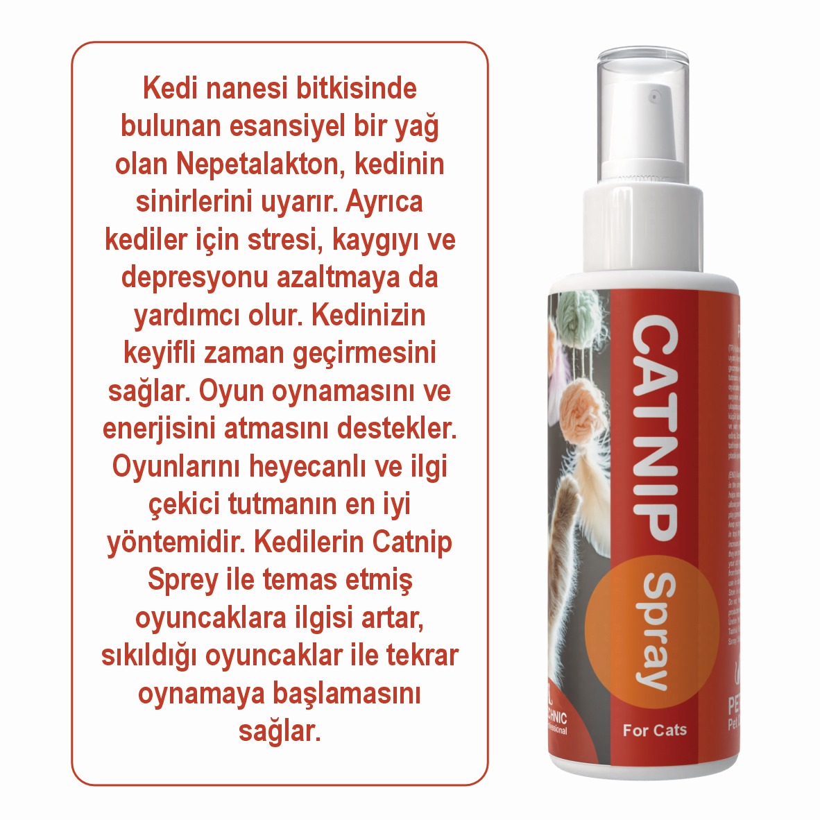 Pet-Technic Kedi Nanesi Spreyi, kedinizin ruh halini iyileştirerek, eğlenceli ve sağlıklı bir yaşam sürmesine olanak tanır. Doğal içerikleri sayesinde gönül rahatlığıyla kullanabilir, kedinizle kaliteli zaman geçirebilirsiniz. Stresli günlerine renk katmak ve eğlenceli oyun deneyimleri sunmak için Pet-Technic Catnip Spray’i hemen deneyin!