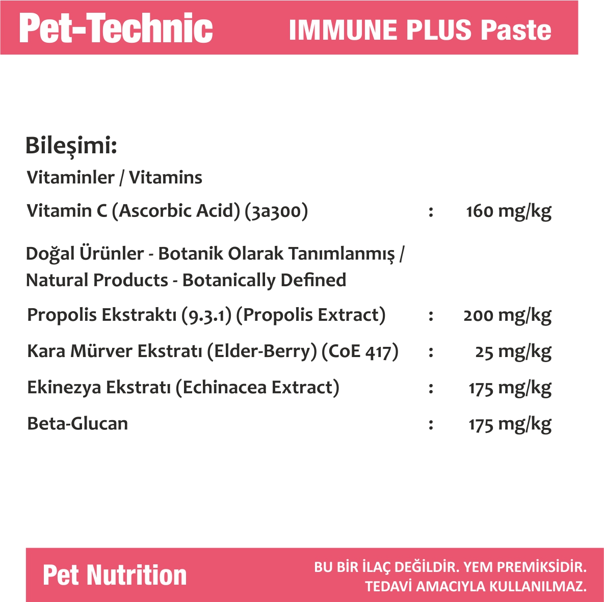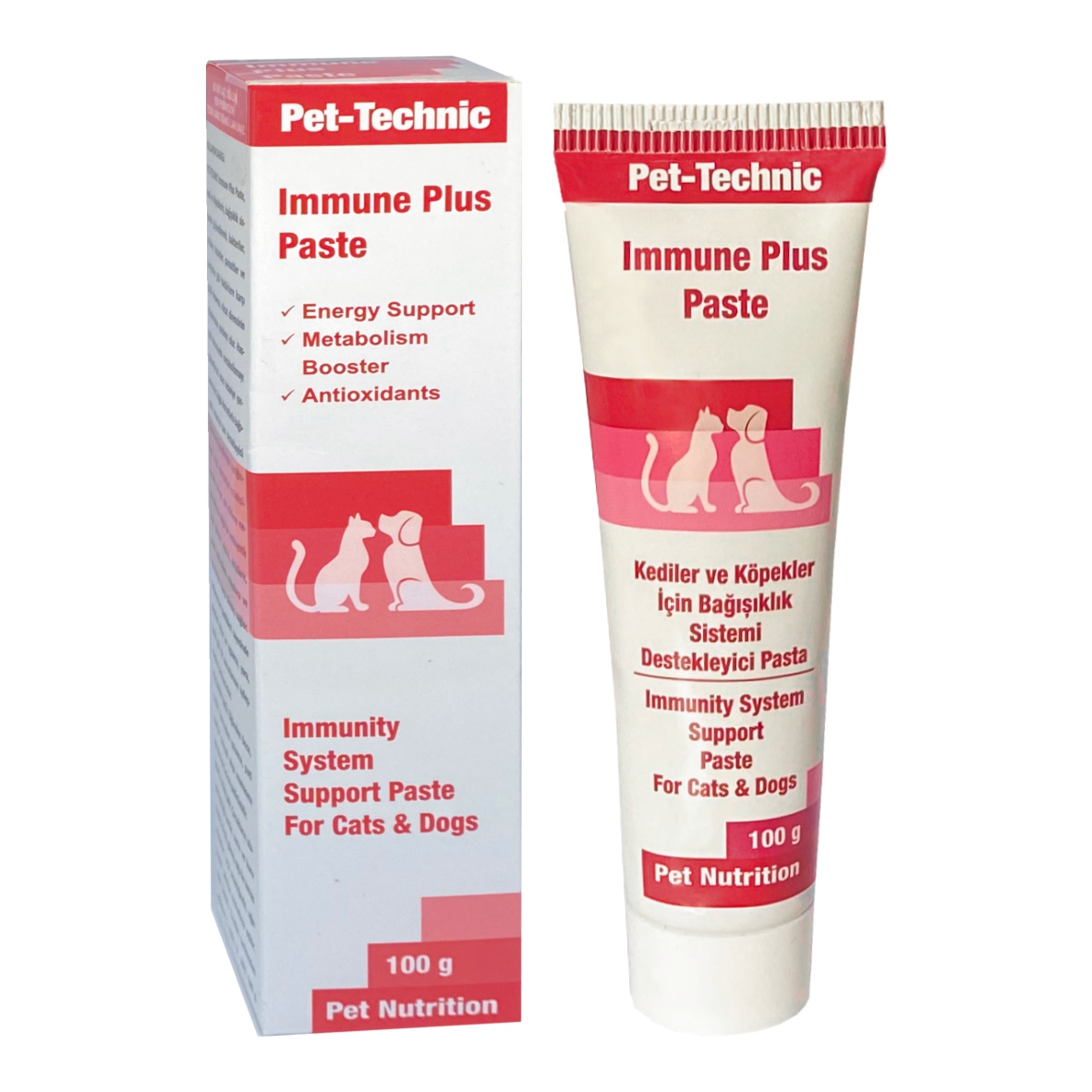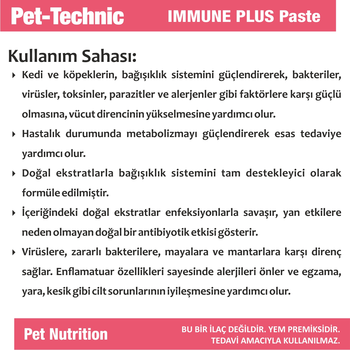 PET-TECHNIC Immune Plus Paste, kedi ve köpeklerin, bağışıklık sistemini güçlendirerek, bakteriler, virüsler, toksinler, parazitler ve alerjenler gibi faktörlere karşı güçlü olmasına, vücut direncinin yükselmesine yardımcı olur. Hastalık durumunda metabolizmayı güçlendirerek esas tedaviye yardımcı olur. Doğal ekstratlarla bağışıklık sistemini tam destekleyici olarak formüle edilmiştir. İçeriğindeki doğal ekstratlar enfeksiyonlarla savaşır, yan etkilere neden olmayan doğal bir antibiyotik etkisi gösterir. Ayrıca, virüslere, zararlı bakterilere, mayalara ve mantarlara karşı direnç sağlar. Enflamatuar özellikleri sayesinde alerjileri önler ve egzama, yara, kesik gibi cilt sorunlarının iyileşmesine yardımcı olur.